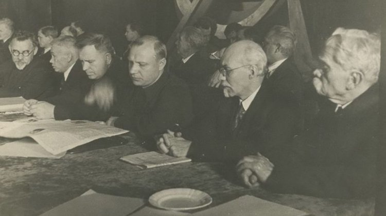 И.И. Шмальгаузен за столом президиума Киевского горсовета на торжественном собрании, посвященном 100-летнему юбилею Киевского университета. Киев, 17 декабря 1935 г.